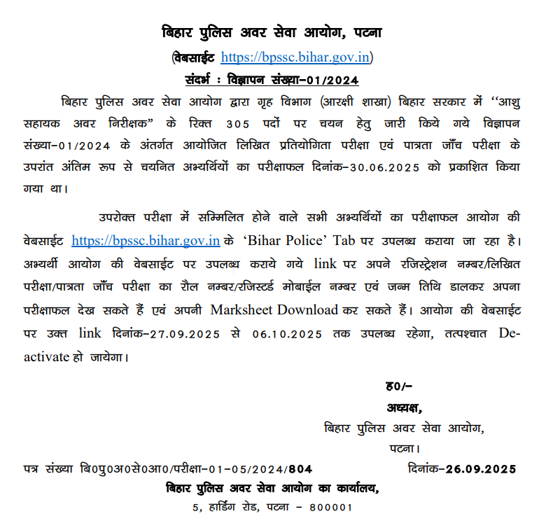 The marks for the Steno Assistant Sub Inspector (ASI) recruitment have been made public on the Bihar Police Subordinate Services Commission’s (BPSSC) official website.